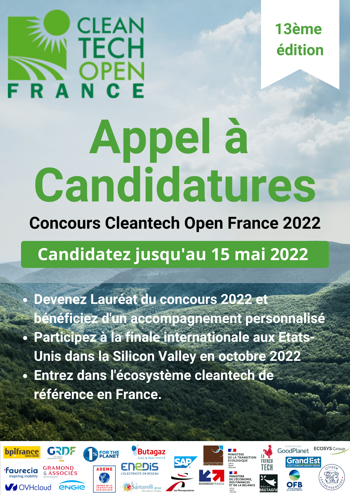 Jusqu’au 15 mai 2022, les startups cleantech engagées dans à la transition environnementale, énergétique et climatique, sont appelées à déposer leur dossier de candidature pour participer à la 13e édition de Cleantech Open France. Pendant un an, les 9 lauréats bénéficieront, entre autres, d’un accompagnement personnalisé par les experts du réseau Cleantech Open France, un écosystème aux nombreuses opportunités. Le gagnant participera à la finale internationale qui se déroulera dans la Sillicon Valley fin octobre 2022. À la clé : une dotation de 5 000 USD.