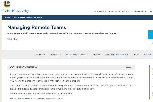 Global Knowledge offre une formation gratuite intitulée « Managing Remote Teams » pour aider les gestionnaires à relever les défis actuels. La formation enseigne aux gestionnaires comment : mettre en place une équipe à distance, planifier des communications efficaces avec les télétravailleurs de l'équipe, régler les problèmes lors des réunions, favoriser l'inclusion et la confiance des télétravailleurs et résoudre les enjeux technologiques pour mener les activités commerciales.
