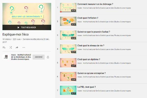 Le célèbre Institut national de la Statistique et des Études économiques (Insee) a réalisé en 2017 une série de vidéos de vulgarisation de l’économie et autres thématiques liées à la statistique. Ces vidéos sont l’occasion de réviser ses classiques. pendant le confinement.