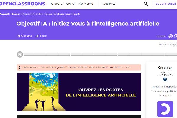 Depuis le 2 avril, OpenClassrooms en partenariat avec l’Institut Montaigne et la fondation Abeona, a mis en ligne un programme d'initiation à l’intelligence artificielle. L’objectif est ambitieux : former plus de 650 000 Françaises et Français aux enjeux liés à l'intelligence artificielle et aux nouvelles technologies en moins de six heures.