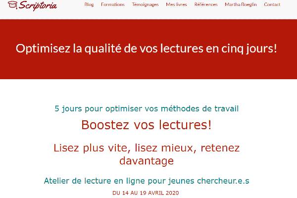 L’entreprise Scriptoria propose des formations et du coaching à destination des doctorants. Elle offre du 14 au 19 avril un atelier de lecture en ligne pour aider les jeunes chercheurs à optimiser leurs méthodes de travail pendant le confinement.
