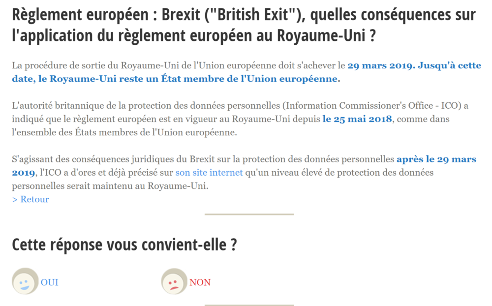 J’avoue que j’ai longtemps hésité à cliquer sur « oui » ou sur « non »… Mon esprit critique me poussait à cliquer « non » car je trouvais la réponse par trop « light » comme on dit dans la langue de Shakespeare. Mais finalement j’étais assez content de la réponse « S’agissant des conséquences juridiques du Brexit (…) l’ICO a d’ores et déjà précisé sur son site qu’un niveau de protection des données personnelles serait maintenu au Royaume Uni ».
