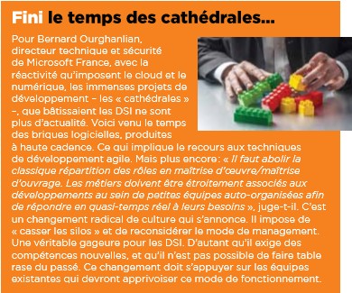 Cette frénésie d’amélioration permanente devient le modèle, la norme. Les DSI doivent se mettre au diapason. Ainsi, en matière de développement de logiciels, « on n’attend plus d’eux qu’ils bâtissent des cathédrales, mais qu’ils fournissent à grande cadence des briques jetables et directement utilisables », dit joliment Bernard Ourghanlian, directeur technique et sécurité de Microsoft France. La formule résume parfaitement la situation et met en évidence l’ampleur des changements à opérer (lire encadré). Il est alors question de « programmation agile ». Mais pas seulement. Comme le souligne le Cigref : « Il ne s’agit pas uniquement d’opposer le traditionnel cycle de développement en V à la programmation agile, mais aussi de mettre en place des processus pour atteindre un état dans lequel l’entreprise pourra changer rapidement de direction selon les conditions d’évolution du marché. » Vaste programme. Les DSI, les chief digital officer et autres nouveaux venus, comme les business information officers, dont le rôle est de valoriser le capital informationnel de l’entreprise via le big data, ont de quoi s’occuper. Pour longtemps…