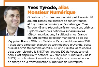 C’est le choix que vient de faire la SNCF. Elle ScreenHunter_76 Dec. 05 16.59met sur les rails un ambitieux projet de transformation numérique qui consiste non seulement « à ajouter une couche de services supplémentaire pour les voyageurs, mais aussi à revoir les modes de production de l’entreprise, la façon de repenser la maintenance des trains, de surveiller le réseau ferré et de gérer la sécurité », comme l’a indiqué Guillaume Pepy, le président du groupe. Et la SNCF a trouvé pour ce faire son « Monsieur Numérique » en la personne d’Yves Tyrode (lire encadré). DSI ou directeur numérique ? Pour le Cigref, en réalité, la question n’est pas là. Il écrit dans un récent rapport*: « Aucun acteur n’est légitime à lui seul, du fait de la transversalité des impacts du numérique. Les différentes fonctions de l’entreprise doivent coopérer pleinement pour assurer la réussite des objectifs numériques. » Il prêche donc pour la mise en place d’une « gouvernance numérique », gérée au plus haut niveau (direction générale et conseil d’administration), la gouvernance étant entendue comme « l’art de décider ensemble ».