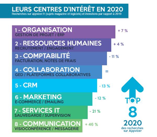 L’édition de 2020 montre que les effets de la transformation numérique ont été largement amplifiés par l’épidémie de Covid-19 et le recours massif au télétravail. Ainsi la plateforme d’Appvizer a constaté une explosion des recherches sur les logiciels SaaS, particulièrement sur les outils collaboratifs en ligne (réseaux sociaux internes, gestion de tâches, stockage, partage de fichiers, visio, etc.)..