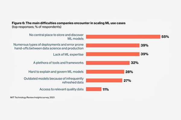 L’impact du ML sur l’entreprise est limité par des difficultés à gérer son cycle de vie de bout en bout. Pour de nombreuses entreprises, le passage à l’échelle des cas d’usage de ML est extrêmement complexe. Le défi le plus important, selon 55 % des répondants, est l’absence d’un lieu central pour stocker et explorer les modèles de ML.