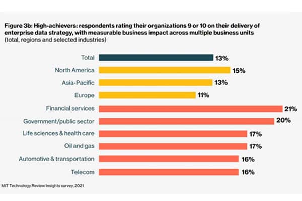 Seulement 13 % des entreprises excellent dans la mise en œuvre de leur stratégie data . Ce groupe d’excellence restreint obtient des résultats métiers mesurables dans toute l’entreprise. Son succès provient de l’attention portée aux fondations d’une gestion et d’une architecture de données solides, qui permettent de « démocratiser » les données et de tirer de la valeur du machine learning (ML).