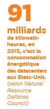 En Europe, 2 % de l’énergie produite est directement consommée par les datacenters. C’est le constat de Green Data Net, un consortium d’entreprises privées et d’organisations comme le CEA ou l’Ecole polytechnique fédérale de Lausanne, qui planche sur l’optimisation de la consommation énergétique des datacenters en milieu urbain. Et, rien qu’en 2013, les « centres de données » présents sur le territoire américain ont avalé 91 milliards de kilowatt-heures, selon une estimation du Natural Resource Defense Council (NRDC). « C’est suffisamment d’électricité pour alimenter tous les foyers de New York, deux fois », précise le NRDC. Un chiffre qui n’est d’ailleurs pas près de diminuer : l’organisation évalue à 140 milliards de kilowatt-heures d’ici à 2020 la consommation énergétique des datacenters aux Etats-Unis…