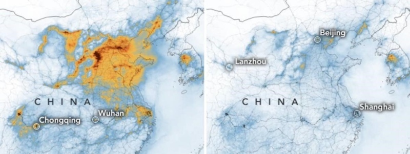 Chine cartePubliées courant mars par la Nasa et l’Agence spatiale européenne (ESA), ces images satellites montrent que les niveaux d’émission de dioxyde d’azote dans les grandes villes de l’Est et du Centre de la Chine (où sont situées de nombreuses usines chimiques, des aciéries et cimenteries) ont chuté de 30 % au cours des deux premiers mois de l’année. Le niveau de ce polluant est repassé en avril dernier à 25,4 par mètre cube d’air, contre 24,6 en avril de l’an dernier.