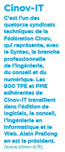 La première action, c’est l’éducation. C’est la raison pour laquelle Cinov-IT s’est fortement investi en tant que contributeur dans la rédaction du programme gouvernemental Transition numérique (www.transition-numerique-plus.fr). Le syndicat y a notamment défini l’ensemble des besoins des PME. Ceux-ci sont multiples : ils vont du partage de fichiers et de données centralisées à la messagerie et l’agenda, en passant par le site Web ou la téléphonie. Ce programme est une très bonne idée et, pour gagner en popularité, il mériterait un soutien institutionnel et financier plus conséquent.