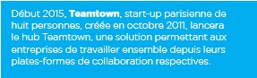 Le hub privé développé pour BoostAeroSpace est entré en phase pilote en octobre, et le hub public sera en beta test début 2015. Nous prévoyons une seconde levée de fonds conséquente pour le deuxième trimestre 2015, pour soutenir notre R&D, très coûteuse compte tenu du nombre de plates-formes que nous supportons. Le hub Teamtown est compatible avec six outils collaboratifs du marché – plates-formes documentaires et de partage de fichiers, et réseaux sociaux d’entreprise –, et nous voulons passer à vingt d’ici à la fin 2015.