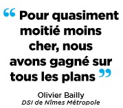 Olivier Bailly. En 2009, quand notre projet a démarré, il n’y avait pas encore d’offres de cloud public. Nous sommes donc partis d’une feuille blanche. La volonté politique était de refondre les systèmes d’information (SI) de Nîmes Métropole et de la ville en un seul et unique système d’information durable. Nous avons réalisé un schéma directeur, appelé EcoTic, qui dressait les grands axes de développement de la plate- forme mutualisée. Elle devait être plus économique, plus écologique et plus à l’écoute des besoins de nos agents et concitoyens. Le cloud répondait à ces problématiques. En centralisant et mutualisant les ressources informatiques de la ville, de l’agglomération et de communes membres, nous voulions réaliser des économies, consommer moins d’énergie et faciliter le déploiement de nouveaux services.