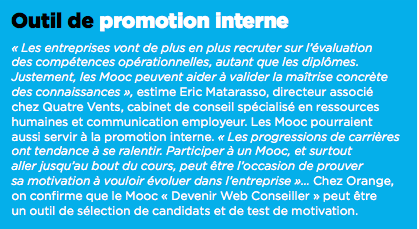 salle de classe. » Depuis 2013, les Mooc font une percée notable auprès des entreprises françaises. On parle désormais de Cooc pour Corporate open online course. Même si les initiatives sont diverses, deux grandes catégories se dessinent. « D’un côté, les Mooc internes. Ce sont des formations dédiées exclusivement aux salariés de l’entreprise visant à améliorer les compétences. On retrouve donc le même objectif que celui de l’e-learning classique, mais avec les nouveaux outils du Mooc, note Clément Lhommeau. De l’autre côté, les Mooc externes. Il s’agit de formations en ligne proposées par une entreprise gratuitement à tous les internautes. En démontrant ainsi son savoir-faire, elle se positionne en tant qu’acteur de référence dans un domaine. Ces Mooc externes sont un nouveau vecteur de communication et de marketing pour les entreprises. » Depuis l’automne 2013, les 3 000 salariés en France de Worldline, une entreprise du groupe Atos, spécialisé dans les paiements et les services transactionnels, peuvent suivre une quinzaine de Mooc de grandes universités américaines couvrant des domaines allant du management au big data. « L’objectif est de proposer à nos salariés de se former dans des domaines complémentaires à ceux que nous proposons en formation présencielle classique », explique Laurence Poilfoulot, responsable formation chez Worldline en France. Plusieurs dizaines de salariés les ont suivis, à raison de quatre heures en moyenne par semaine sur leur temps de travail. « Le niveau d’enseignement est très au-dessus de la moyenne. A la rentrée 2014, il est question d’étendre ces Mooc à l ’ensemble des 7 200 salariés de Worldline », poursuit-elle. Côté tarifs, la mise en place de cette formation n’a presque rien coûté à l’entreprise, qui finance uniquement les éventuelles demandes de certification émanant de ses salariés (environ 38,60 euros).