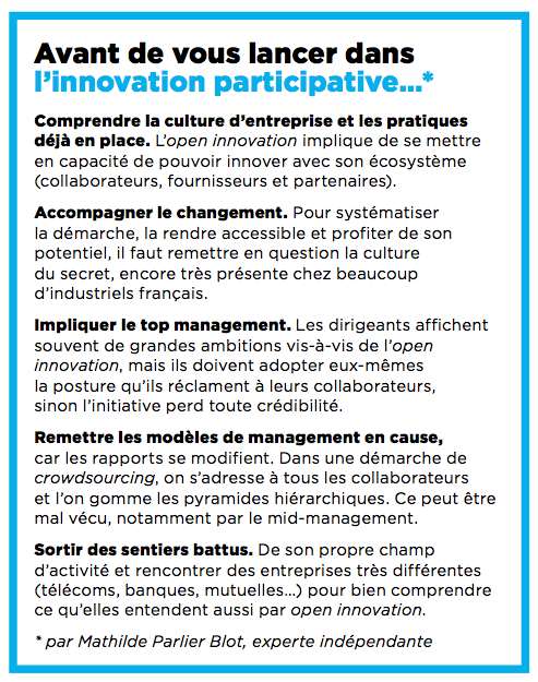 Open source, impression 3D, crowdsourcing, codéveloppement… Les choses commencent à bouger aux Etats-Unis en termes d’innovation, mais également en France. Nos deux constructeurs nationaux ont lancé des initiatives d’innovation ouverte depuis plusieurs années, en suivant des chemins parallèles. Pour l’un comme l’autre, la première forme d’ouverture a consisté à mettre en place des processus collaboratifs avec leurs fournisseurs. Un constructeur automobile moderne, c’est, aujourd’hui, un FEO (fabricant d’équipement d’origine, ou OEM), c’est-à-dire un intégrateur de solutions développées par ses équipementiers. Depuis plusieurs dizaines d’années, ils ont instauré des processus de codéveloppement avec eux. Mais ce mode de fonctionnement ne suffit plus. « Nous pratiquions déjà cette ouverture avec nos principaux partenaires industriels, comme les équipementiers, confie Isabelle Edessa, responsable open innovation chez PSA Peugeot-Citroën. Mais, depuis 2009, nous sommes passés à la vitesse supérieure. La concurrence est plus tendue et les offres produits s’enrichissent de nouveaux services. Le numérique, notamment, a bousculé pas mal de choses. L’innovation ouverte nous permet de relever certains nouveaux défis. » La firme au lion a structuré son effort en direction de quatre grands écosystèmes, depuis les individus – collaborateurs ou clients –, les laboratoires publics de recherche, les start-up et PME et, enfin, les institutions.