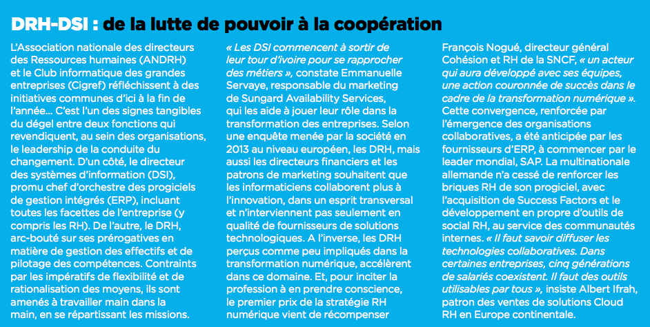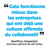 d’équipes précédemment adverses, en les amenant à emprunter le meilleur, les unes aux autres. Quelle qu’en soit la genèse, le management parti- cipatif est le nouveau Graal des entreprises. Toutes disent vouloir en finir avec le fonctionnement en silos, décloisonner les fonctions, fédérer les initia- tives. « Le travail collaboratif répond à une exigence des grandes entreprises. Alors qu’elles deviennent plus globales, leurs structures opérationnelles tendent à se disperser et à se complexifier. Pour retrouver de la cohérence et de la flexibilité, tout en étant innovantes et compétitives, elles encouragent la collaboration entre les équipes », confirme Jean-Luc Vallejo, directeur marketing Nouvel espace de travail chez Orange Business Services. En outre, il devient fréquent que des compétences internes se mêlent à des prestataires extérieurs au sein des projets. Ce qui implique de nouveaux modes d’échanges (lire l’article sur l’open innovation). Les directions générales s’impliquent d’autant plus que les collaborateurs, eux, sont demandeurs. D’après une étude du think tank Innov’acteurs publiée en mai 2013, une majorité de salariés souhaite contribuer davantage à l’innovation au sein de son organisation. Et pour y parvenir, les moyens les plus couramment cités sont les brain-stormings, les boîtes à idées et les plates-formes collaboratives. Sans surprise, les plus jeunes et les spécialistes de la IT sont les plus motivés. « Les moins de 30 ans n’imaginent même pas l ’entreprise dépourvue de réseaux collaboratifs. C’est une façon de travailler inscrite dans leur ADN », insiste Laurent Chollat-Namy, fondateur de la plate-forme de rencontres en ligne dédié aux métiers du numérique, ChooseYourBoss. Et chez Microsoft, éditeur de plusieurs solutions dédiées au travail collaboratif, il est martelé que « favoriser un contexte de partage et d’échange de compétences fait partie de la politique RH, un argument essentiel pour attirer des talents ».