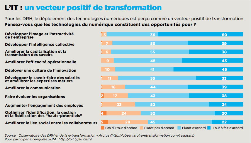 Dans les entreprises, les directions générales attendent des retombées concrètes de ces dispositifs. Elles souhaitent prioritairement en faire un levier du travail collaboratif (92 %), un moyen d’accès aux experts