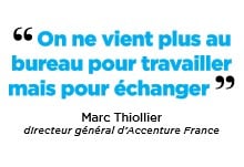 En effet, si la technologie permet la dématérialisation totale de l’entreprise, plus une entreprise accroît son degré de virtualisation, grâce notamment à des outils nomades et partagés, plus elle doit « élever le degré de socialisation entre ses salariés », remarque Accenture. Pour les attirer au siège, le groupe organise des événements atypiques, des concerts, invite le Jamel Comedy Club… Pour Marc Thiollier : « On ne vient plus au bureau pour travailler mais pour collaborer, échanger, réseauter, partager. Cela devient un tiers-lieu pour nos collaborateurs. »