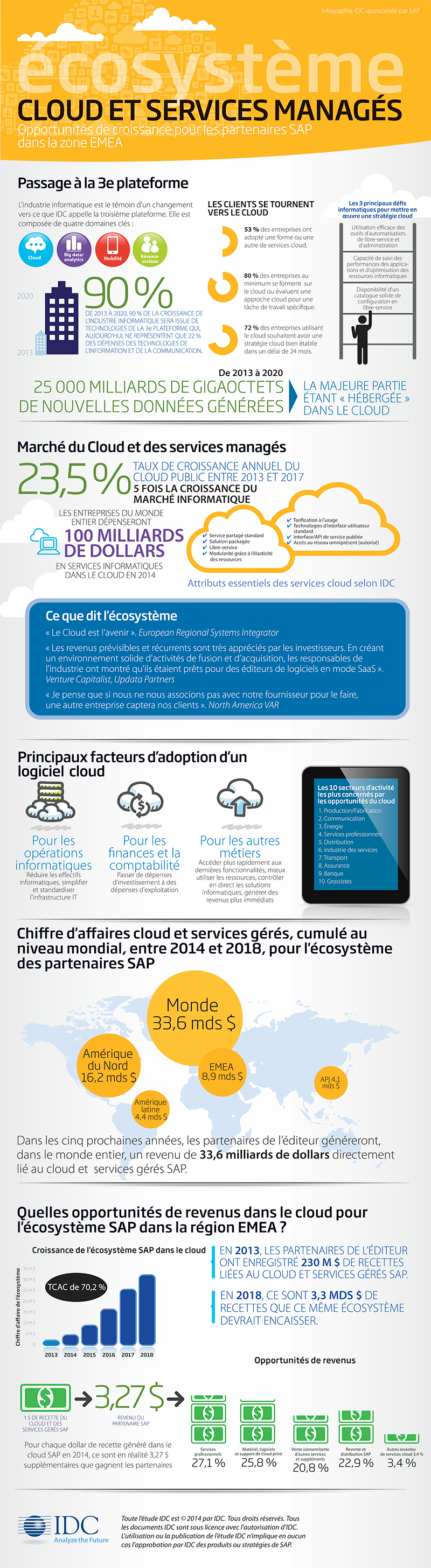 - Dans les cinq prochaines années, les partenaires de SAP généreront un revenu de 33,6 milliards de dollars directement lié au cloud et services managés SAP, et un taux de croissance annuel cumulé au niveau mondial de 58,6%