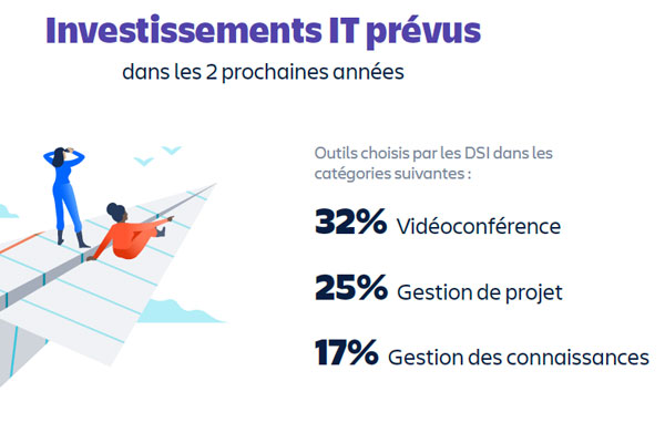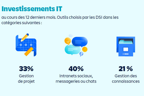 La majorité des entreprises françaises souhaite adapter ses équipements afin d’offrir à ses équipes une expérience collaborative fluide et optimale. Au cours des douze derniers mois, les entreprises ont principalement investi dans des outils pour la gestion de projets (33%), des intranets sociaux, des messageries ou des chats (40%), et la gestion des connaissances (21%). Toutefois, ces investissements ne devraient se maintenir que légèrement au cours de ces deux prochaines années, les entreprises espérant continuer de miser sur l’acquisition ou le développement de solutions de gestion de projets (38%) et de gestion des connaissances (28%). En outre, 32% des entreprises prévoient d’investir davantage dans les outils de vidéoconférence.