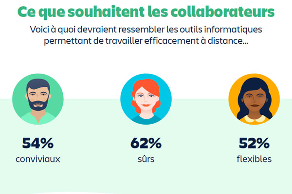 Pour que les investissements en faveur de la collaboration numérique apportent une véritable valeur ajoutée à l’expérience collaborative des employés, il est important de prendre en compte l’avis des équipes dans le processus de décision. L’enquête Collaboration Maturity Score montre que, selon les salariés, les outils informatiques doivent être protégés (62%), conviviaux (54%), et flexibles (52%) pour que le travail à distance soit efficace. Ils souhaitent avant tout disposer des capacités de collaboration (18%), d’outils de messagerie instantanée (16%), et de gestion des connaissances (14%). Par ailleurs, 16% d’entre eux estiment qu’une réorientation de la culture d’entreprise est nécessaire. Celle-ci est même une condition indispensable pour obtenir un indice de maturité de collaboration plus élevé.
