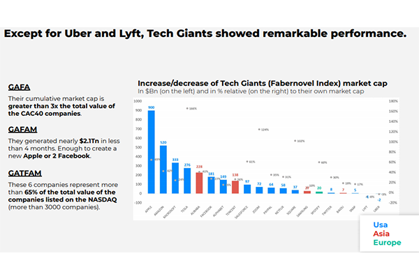 En revanche, il faut noter qu’il est souvent difficile d’évaluer la richesse réelle des grands acteurs numériques. Au mois de mars dernier, nous avons vécu un emballement boursier autour des valeurs technologiques américaines, à l’image d’Amazon, Alphabet et Apple qui ont parfois dépassé les 1000 milliards de capitalisation boursière. Mais quelques mois plus tard, le Nasdaq 100, regroupant l’ensemble des géants de la tech, a décidé de rectifier ses projections en perdant près de 5% la semaine dernière. Ces fortes fluctuations sont le fruit d’une déconnexion entre économie réelle et financière et viennent nuancer le succès des Gafam, sans pour autant remettre en cause leur capacité à s’adapter.