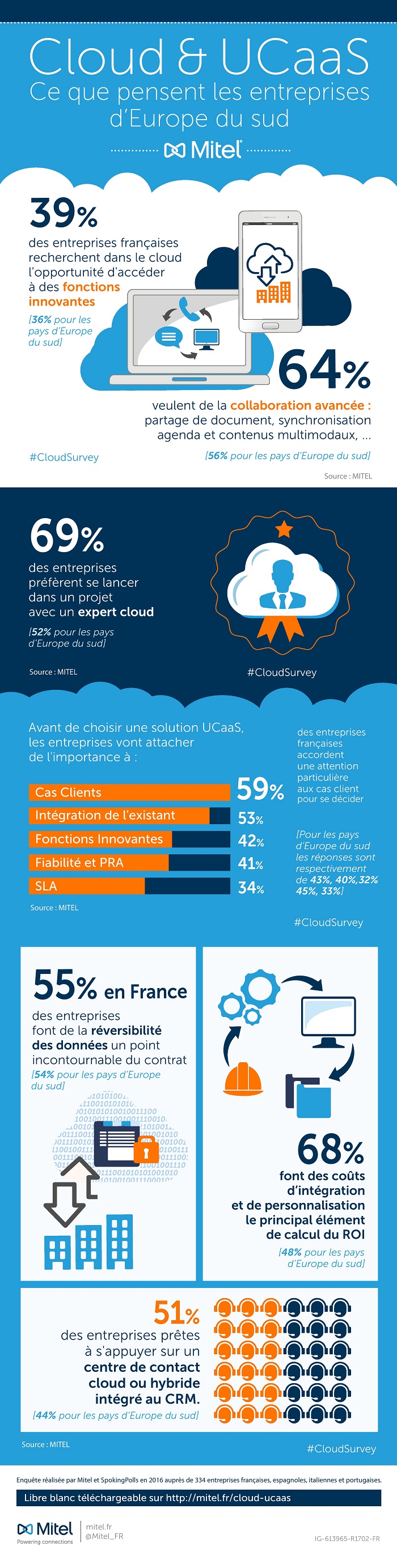 Mitel® (Nasdaq : MITL) (TSX :MNW), ldévoile au travers d’une infographie* les résultats d’une enquête menée auprès de plus de 300 décideurs d’entreprises d’Europe du Sud visant à discerner l’intérêt porté au cloud et aux communications d’entreprise en mode « As-A-Service », et le niveau de maturité lié à l’adoption de ces technologies selon les pays.