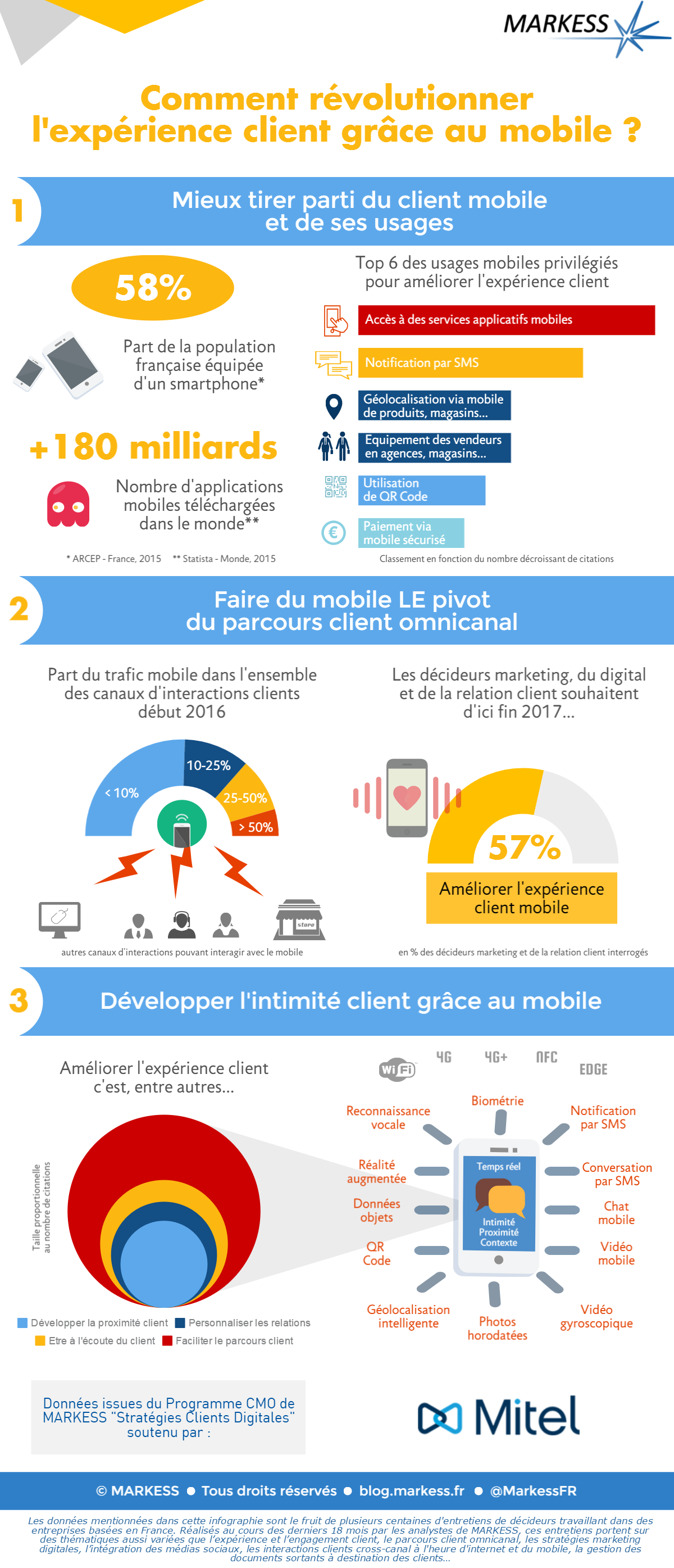 Markess, société d’études expert des marchés du numérique, a réalisé pour Mitel® (Nasdaq :MITL) (TSX :MNW), l’un des leaders mondiaux dans le domaine des communications cloud, mobiles et temps-réel pour les entreprises, une infographie intitulée « Comment révolutionner l’expérience client grâce au mobile ? ». Celle-ci confirme que la majorité des entreprises sont sensibilisées à l’importance grandissante du mobile et qu’il constitue indéniablement l’un des vecteurs de l’expérience client dont elles doivent s’emparer.