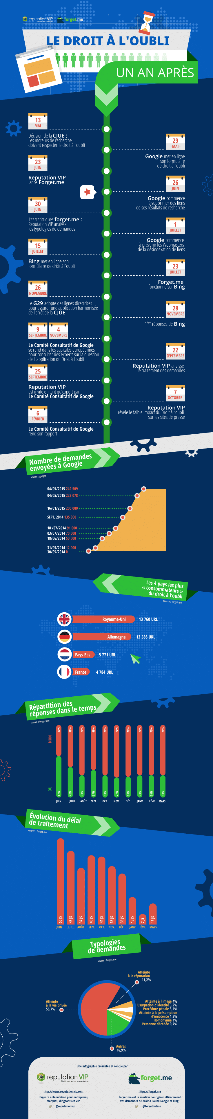 L’infographie ci-dessous, réalisée par Reputation VIP et le site Forget.me, dresse un bilan de la première année du droit à l’oubli.