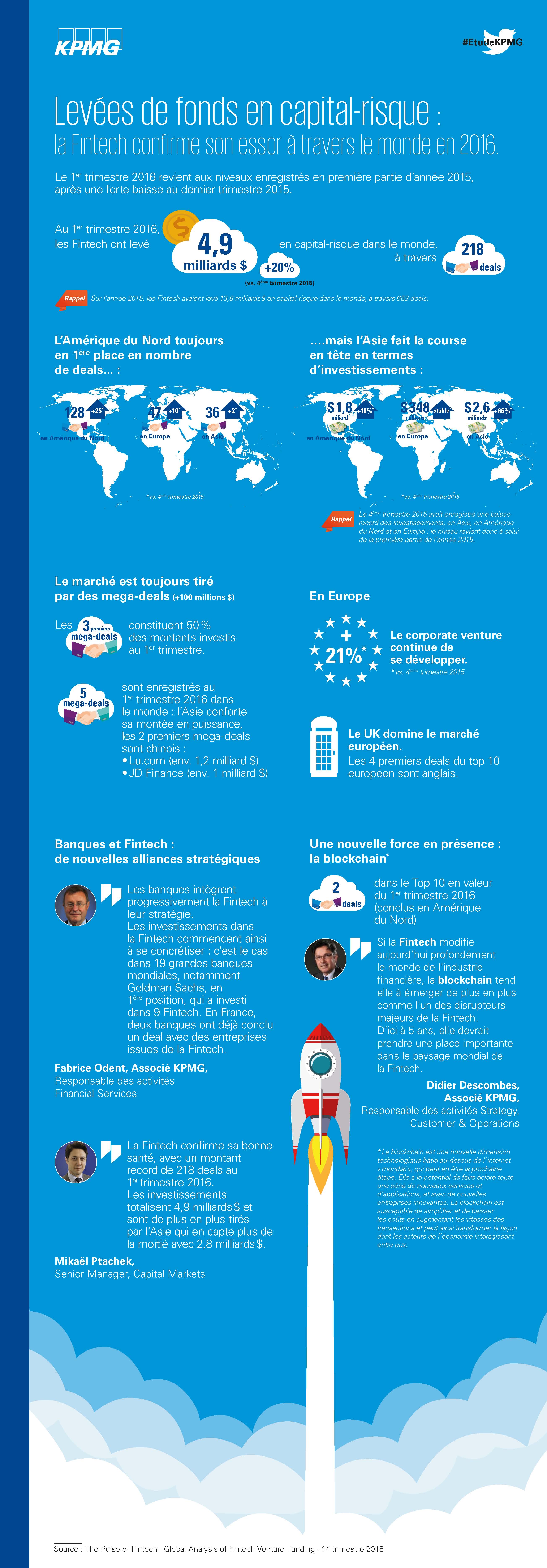 KPMG publie son étude trimestrielle sur l’essor des Fintech à travers le monde (1er trimestre 2016), plus particulièrement en matière de levées de fonds en capital-risque, sous forme d’infographie.