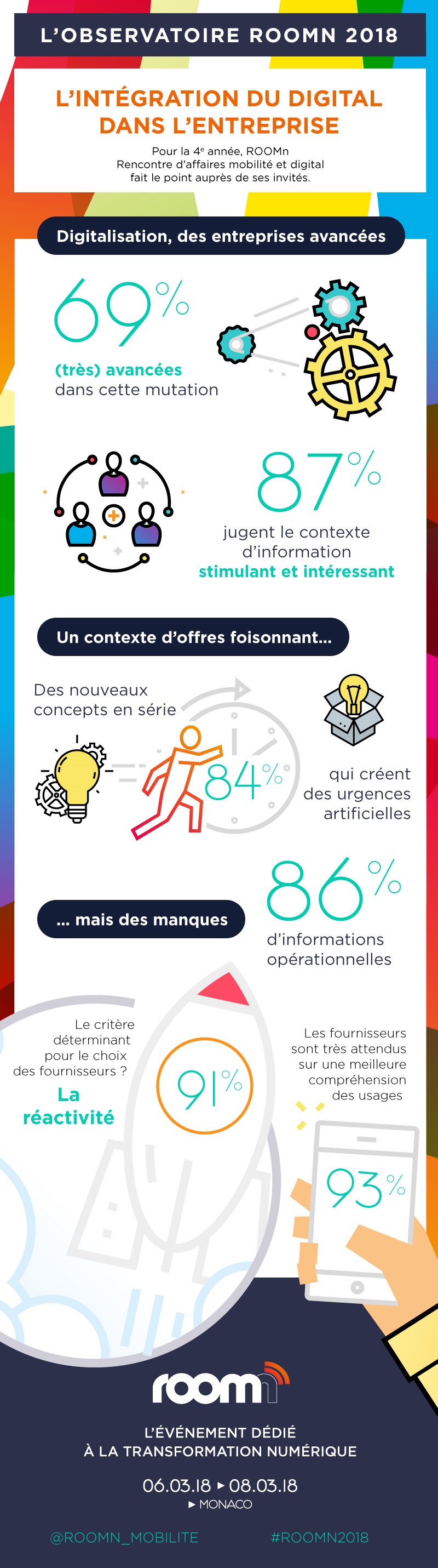 Pour la 4ème année consécutive ROOMn, la rencontre d’affaires Mobilité et Digital, a interrogé les décideurs porteurs de projets de transformation digitale afin de connaître leur perception du marché. Un constat pour une grande majorité : un marché foisonnant mais qui par manque d’information plus opérationnelle et concrète, les laisse sans repères. Néanmoins, la transformation numérique reste en bonne voie pour 69% des entreprises interrogées.