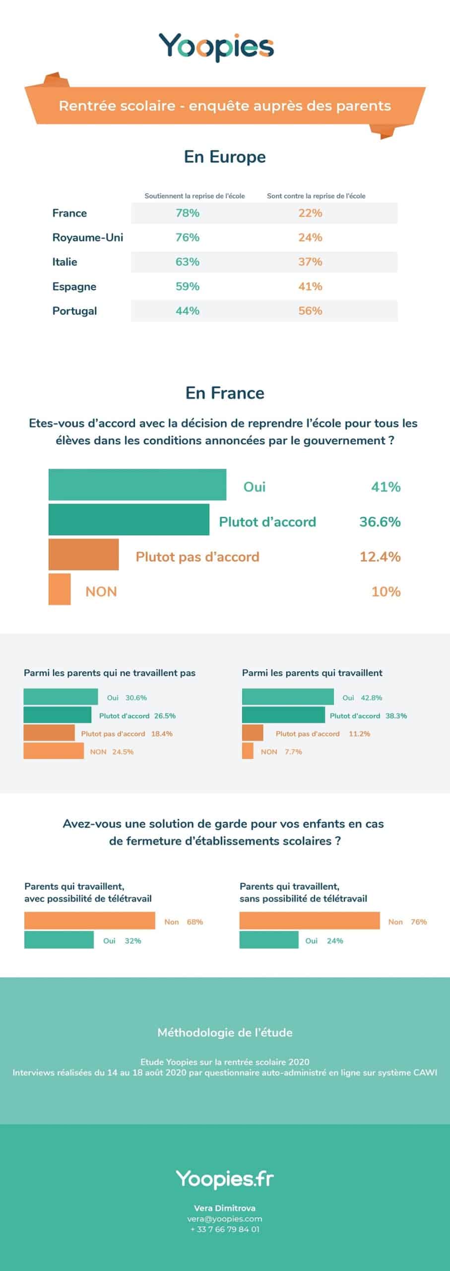 Malgré l’incertitude concernant l’évolution de l’épidémie Covid-19, une augmentation des cas à travers l’Europe, ainsi que les craintes d’une deuxième vague à l’automne, une chose est sûre : la plupart des parents à travers l’Europe veulent que leurs enfants retournent à l’école. Yoopies, leader européen des services de garde d’enfants, a mené une enquête auprès de près de 3000 parents en France, au Royaume-Uni, en Espagne, au Portugal et en Italie. C’est en France que les parents sont les plus impatients : l’enquête montre que 78% soutiennent la reprise de l’école dans les conditions annoncées par le gouvernement.