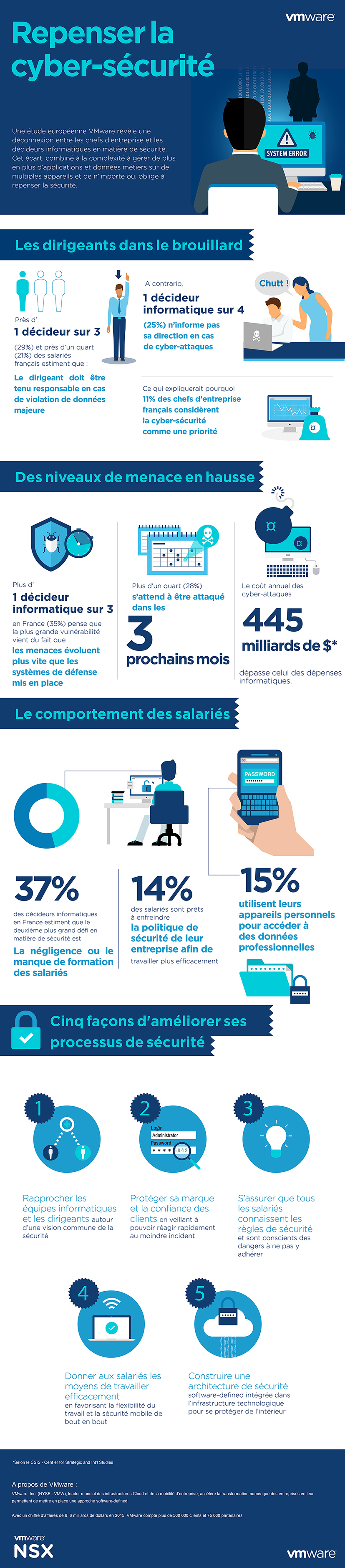 VMware a réalisé l’infographie ci-dessous qui révèle une déconnexion entre les chefs d’entreprise et les décideurs informatiques en matière de sécurité.