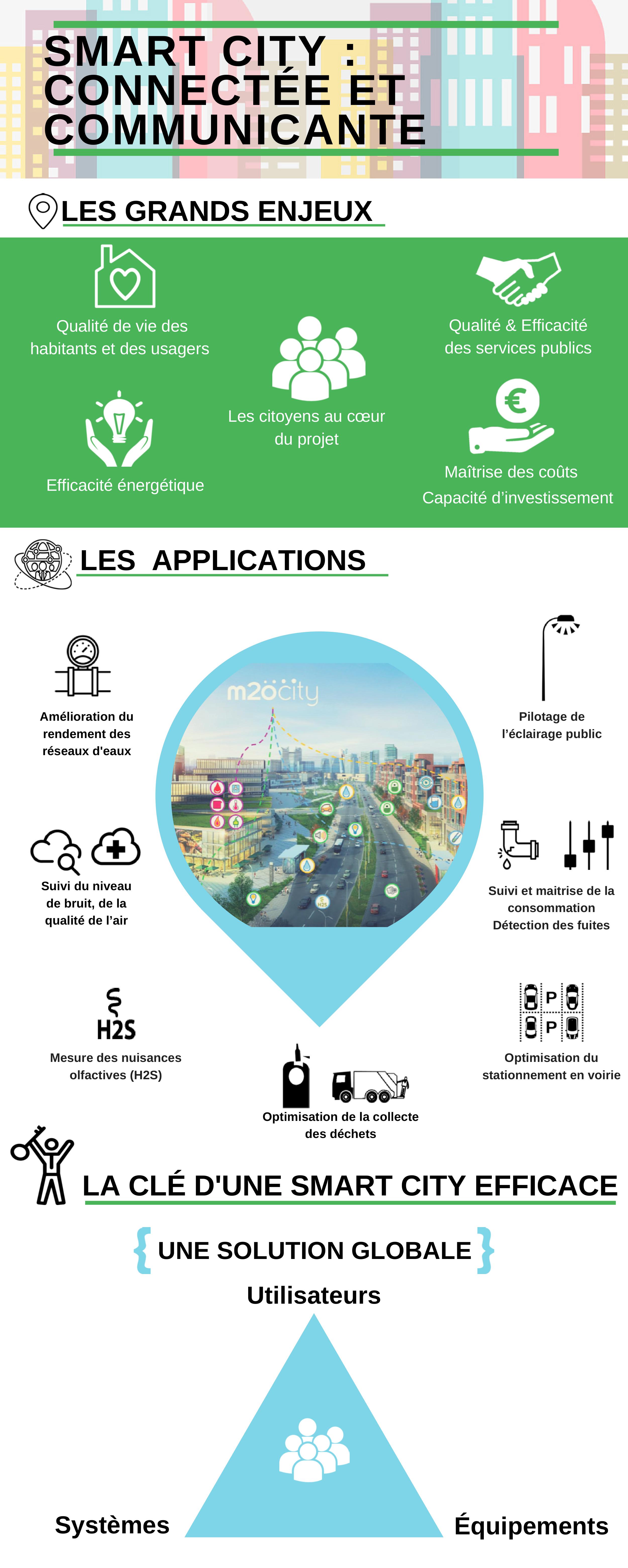 1er acteur dédié aux objets connectés en France, m2ocity a réalisé l’infographie ci-dessous qui met en avant le concept de Smart City.