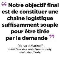 Opérations récurrentes de promotion, de marketing ou de packaging des produits, renouvellements rapides et réguliers de l’offre, succès incertain de certains articles… sur un marché des produits de beauté et de cosmétiques très variable, où l’approche commerciale doit évoluer en permanence, L’Oréal ne peut qu’être très réactif pour coller aux caprices de la consommation et gagner des parts de marché. Cela demande d’avoir une chaîne d’approvisionnement d’articles de conditionnement (flacons, étuis, capsules…) et de marketing ( étiquettes, échantillons…) la plus flexible possible pour répondre à la variation des besoins. « Notre objectif final est de constituer une chaîne logistique suffisamment souple pour être tirée par la demande », expose Richard Markoff, directeur des standards supply chain de L’Oréal.