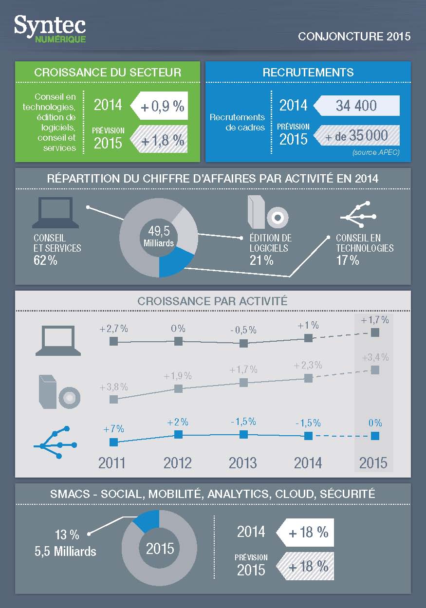En 2015, Syntec Numérique prévoit une croissance de 1,8 %, malgré des niveaux de croissance qui resteront inférieurs à ceux de 2011.