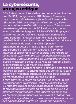 croissante, un tonnage important ne signifie plus forcément des effectifs nombreux, y compris pour les militaires. « Une frégate multimission (Fremm) de 140 mètres de long et de 6 000 tonnes ne nécessite plus que 150 hommes, contre près de 250 pour de précédentes versions, explique Jean-René Spagnou, RSSI de DCNS, leader mondial du naval de défense. Aujourd’hui, un navire est tout simplement rempli d’informatique. Que ce soit pour les systèmes de navigation, de conduite ou de combat. Et, comme dans une usine, on trouve énormément de systèmes Scada à bord. » Facteur d’efficacité accru certes, cet état de fait est aussi source de risques. Ce qui n’empêche pas de nombreux constructeurs de se poser sérieusement la question du « cargo-drone », un navire sans équipage à la manière de ce qui est devenu une réalité pour l’automobile.