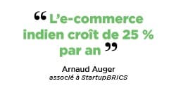 acteur national », précise Arnaud Auger. Soutenu par ces fonds d’investissement et par la croissance du nombre d’internautes et des usages mobiles, l’e-commerce en Inde explose ! De grands acteurs locaux qui ont ainsi émergé comme Flipkart, Snapdeal, Paytm ou Jabong rivalisent désormais avec Amazon et eBay. « Avec un chiffre d’affaires estimé à plus de 25 milliards de dollars en 2015, l’e-commerce indien est considéré comme le marché qui a la croissance la plus rapide en Asie Pacifique », indique Arnaud Auger. Dopé par 354 millions d’internautes (503 millions prévus en 2017) et 930 millions d’utilisateurs de téléphones mobiles, l’e-commerce croît de 25 % par an. Dans un tel contexte de consommation numérique, pas étonnant de voir BlablaCar, le spécialiste français du covoiturage, ouvrir son site Web de réservations dans le pays. En s’y lançant depuis janvier dernier, l’entreprise tricolore mise sur le déficit de modes de transport de dernière minute (transports en commun bondés et difficiles à réserver) et sur le covoiturage de longs parcours dans cet immense pays continent. « Le plus difficile va être de bâtir une communauté qui proposera de partager, en quelques minutes, un trajet entre une ville et une autre », déclarait début 2015, Frédéric Mazzella, son président-fondateur.
