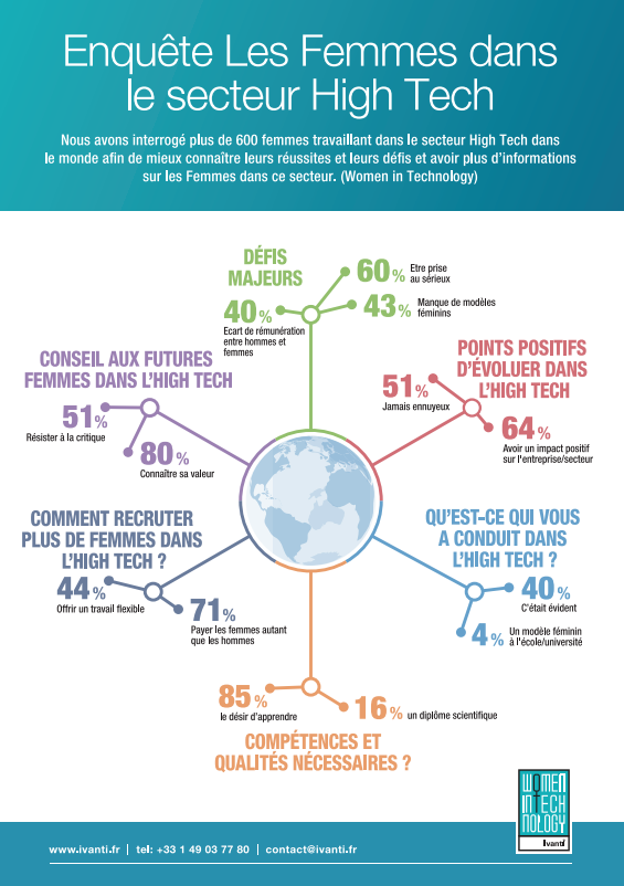 L’infographie illustrant les femmes dans le secteur High Tech est présentée par Ivanti suite à une enquête realisée sur 500 femmes qui travaillent dans l’IT.