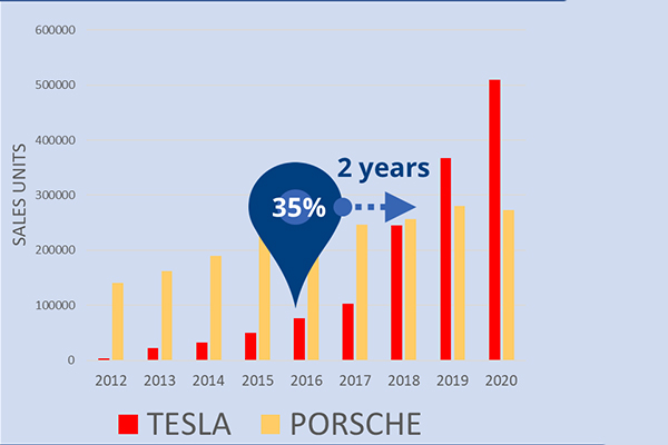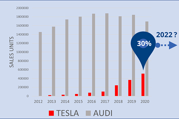 Elon Musk nous avait expliqué dans un scepticisme général que la voiture allait se résumer à un iPad sur roues. Le scepticisme a fondu à mesure que les ventes de Tesla, qui représentaient un petit quart de celles de Porsche en 2015, ont culminé l’année dernière à presque le double de celles de son concurrent, avec 499 550 unités contre 272 162 pour l’Allemand. Avec les mêmes tendances, si l’on se souvient que les ventes de Tesla représentaient 35% de celles de Porsche en 2016, et que l’américain a rattrapé l’allemand en 2018, serait-il possible que Tesla, dont les ventes représentent 30% de celles d’AUDI cette année, dépasse ce dernier dès 2022 ?