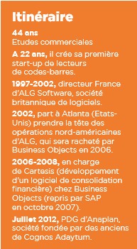 « Chez SAP, je connaissais le marché et ses besoins. Je me suis immédiatement rendu compte que nous tenions LA solution. Et j’ai su tout de suite que je pourrais travailler avec Michael. » Un mois plus tard, la famille s’installait à Palo Alto (Californie). Il abandonne une situation confortable de patron de branche chez SAP et divise son salaire par deux. Un package, « très classique », lui promet la fortune si la réussite d’Anaplan est au rendez-vous. En fait, Frédéric est retombé dans la marmite de l’entrepreneur qu’il est resté. Il a créé sa première entreprise à 22 ans, une société de lecteurs de codes-barres. Et évoluera ScreenHunter_35 Nov. 13 12.19constamment dans l’univers des start-up au gré de leurs rachats. « Il y a trois choses que je suis de près. D’abord, la technologie : sommes-nous en permanence au bon niveau, comment la rendre encore plus performante ? Ensuite, les clients : je cours le monde pour convaincre d’adopter Anaplan. » Pour eux, il a rédigé le Business user bill of rights. Et les recrutements : « Nous sommes dans une activité où la chasse aux meilleurs fait la différence. » Les astres sont alignés, c’est une « perfect storm », comme disent les Américains . « Je suis sûr que notre technologie répond à des besoins énormes, elle change le mode de fonctionnement des entreprises. Et, pour moi, se battre contre IBM, Oracle ou SAP, c’est formidable. » Ses motivations ? « Je suis passionné par l’idée de créer une entreprise globale. Nous montons ainsi une équipe de développement en France, car il y a de bons ingénieurs. » Et l’aventure humaine : « Je travaille avec certains depuis vingt ans, on crée une gigantesque équipe de foot… S’il n’y a pas de passion, on ne peut pas tenir le rythme. » Son secret ? Une famille stable : trois enfants, une femme moitié Anglaise moitié Italienne, chasseuse de têtes dans les hautes technologies. Pourrait-il revendre cette magnifique idée ? « Sûrement pas. Nous avons déjà eu quelques propositions. Nous verrons dans quinze ans ! » Ses yeux pétillent comme un enfant. « C’est mon Lego, je m’amuse. »