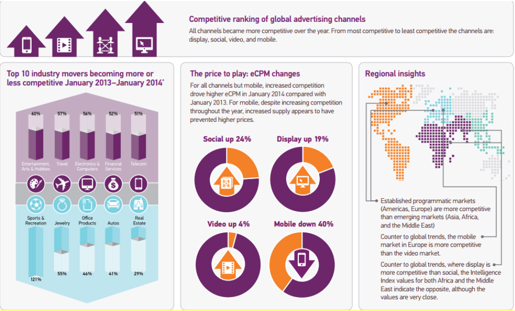 De l’industrie du divertissement à celle des services financiers, les sommes que les entreprises consacrent à la publicité programmatique sont en hausse, avec pour effet de rendre le paysage encore plus concurrentiel. Comme l’infographie ci-dessus le montre, les canaux les plus tendus en 2013 étaient, dans l’ordre d’importance (du plus concurrentiel au moins concurrentiel) : le display, les réseaux sociaux, la vidéo et le mobile. A noter qu’en Europe, le mobile a devancé la vidéo.