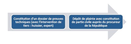 Dans un second temps, une fois le dossier de preuves constitué, il est alors nécessaire de procéder à la qualification juridique des faits en vue d’un dépôt de plainte avec constitution de partie civile. De manière générale, en pareil domaine, il est recommandé de procéder à un dépôt de plainte, par écrit, directement auprès du procureur de la République, la rédaction d’un tel document devant bien entendu faire l’objet d’une attention particulière (exhaustivité des faits, informations indispensables, fondements juridiques qualifiant les infractions commises,…).