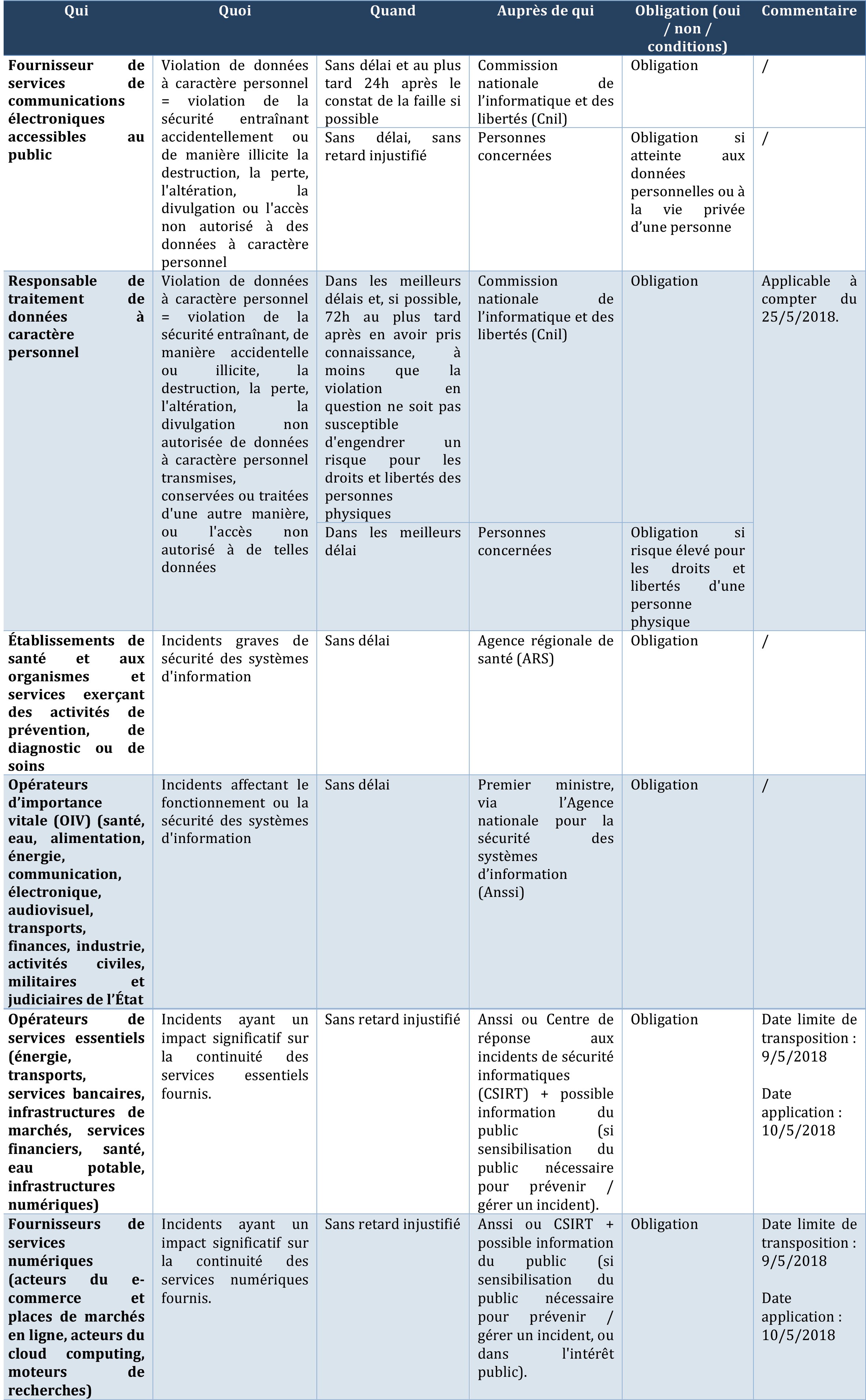Cette question n’est pas des moindre dans la mesure où les textes se multiplient sur ce point : loi Informatique et libertés[1], règlement européen sur les violations de données à caractère personnel[2], règlement européen sur la protection des données personnes (RGPD)[3], loi pour une République numérique[4], loi de programmation militaire[5], loi de modernisation de notre système de santé[6], directive NIS (network, security and information)[7],…