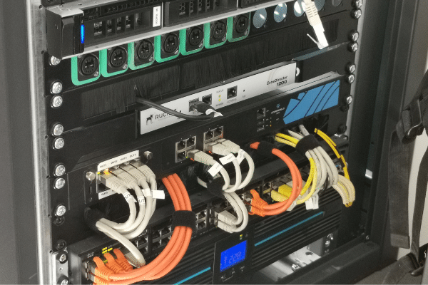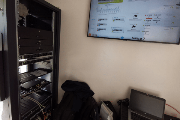 La nature compacte de l’équipement s’explique par le passage au tout IP. Il se compose d’un contrôleur Wi-Fi pour l’administration des bornes Wi-Fi, d’un pare-feu pour la gestion des VLANs et sous-réseaux, d’un switch 48-ports et d’un onduleur de haute capacité.