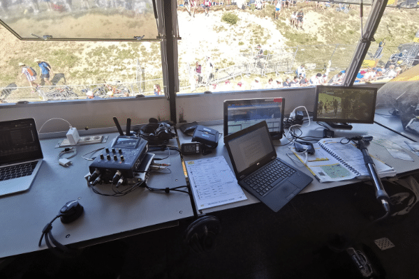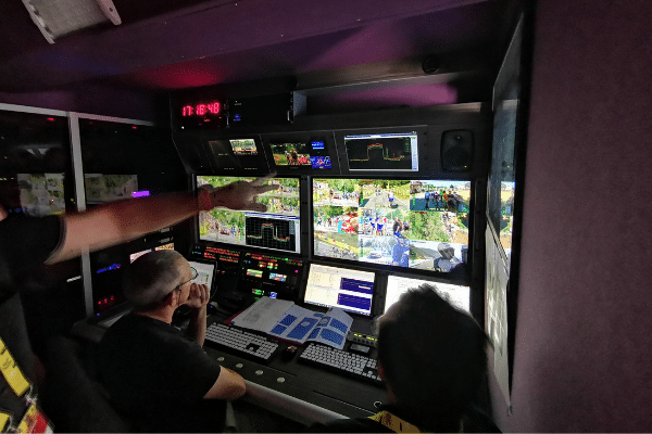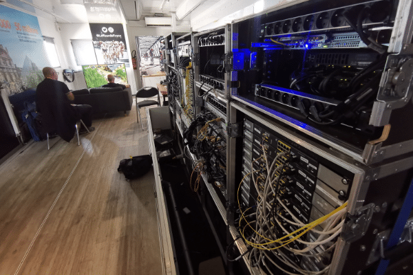 Les moyens mobilisés au départ sont cependant plus légers qu’à l’arrivée où sont notamment réunis tous les médias et diffuseurs. L’infrastructure nécessaire à la fourniture de la connectivité réseau aux clients tient dans une camionnette flambant neuve et une baie. Les techniciens, 4 au départ, disposent également d’un écran pour la supervision temps réel des matériels et de la fourniture en haut débit (FTTO ou FTTH).