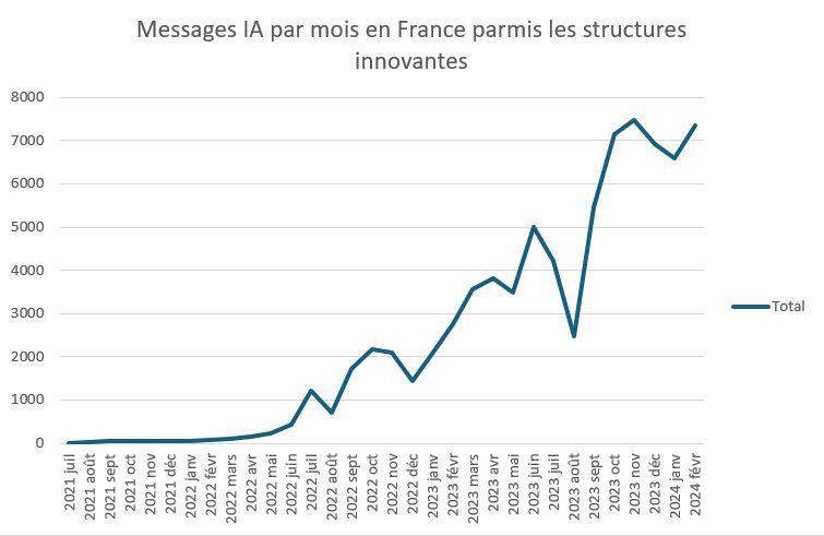 Premier enseignement, le « boom » de l’IA en termes de messages et de commentaires se voit particulièrement à partir du premier trimestre 2023, puis avec un fort regain le mois de septembre suivant, pour ensuite plafonner en début d’année 2024.