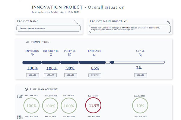 Yves Antier. Notre groupe porte les gros projets de transformation numérique du type CRM (Salesforce) ou relation client (Zendesk) que l’on déploie dans les différents pays, et notamment en France. Mais ce sont des projets très structurés à l’échelle mondiale sur lesquels nous avons peu d’impact. Dans le cadre de la garantie Facom en France, nous avions besoin d’une méthode plus agile, impliquant à la fois nous en tant que fabricant, mais aussi les distributeurs et les utilisateurs finaux. La méthode Innove&Scale nous a accompagnés dans la définition du projet au niveau de l’équipe de direction, travail qui a été suivi de séances de co-création avec les utilisateurs finaux et les distributeurs. En quatre jours, nous avions pratiquement dessiné le produit final… que nous avons pu tester à l’aide d’un POC, avant son industrialisation.